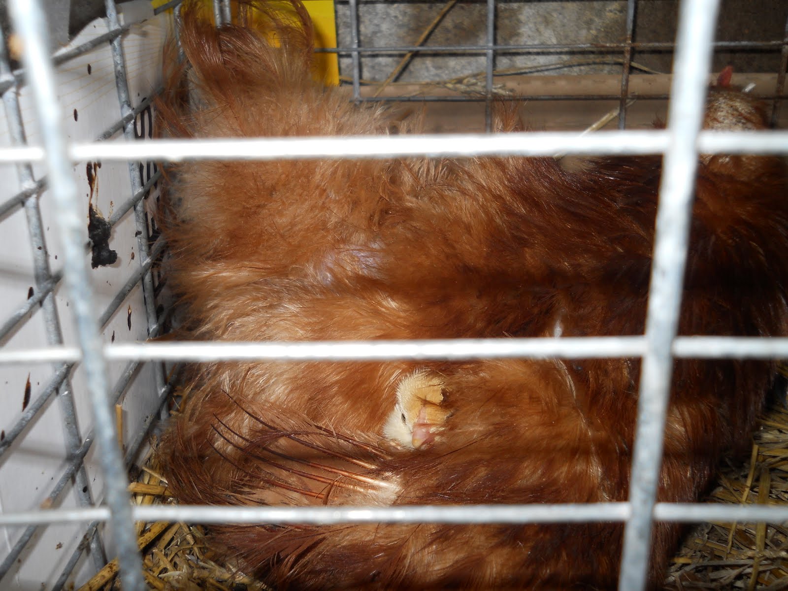 Our new baby peeking out under the wing of her Momma. We have one that hatched this morning and another that is pecking his shell. It is peeping away and is kicking, because the egg shakes back and forth. I will check when I get back from church. I am sure he will have made his grand entrance. Smile! Two more eggs left to hatch. One duck and one chicken.